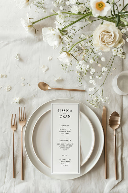Wir bieten eine kuratierte Auswahl an klassischen und modernen Layouts. Jedes Design kann individuell an eure Hochzeit angepasst werden – von Farbgebung über Schriftarten bis hin zu personalisierten Motiven. In unserem Showroom könnt ihr alle Muster in Ruhe ansehen oder bestellt euch gern eine kostenlose Musterkarte.